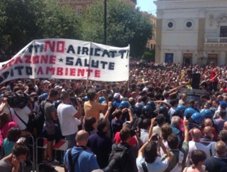 TARANTO – Manifestazione dei lavoratori Ilva interrotta dai manifestanti autonomi. Fumogeni e uova contro il palco. Cgil infuriata: “Rubata la piazza ai lavoratori”.