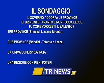LECCE – Riordino degli enti locali, accorpamento delle Province, i risultati del sondaggio parlano chiaro: i salentini aspirano all’unità. In soli 10 giorni sono 2.480 gli utenti che hanno espresso la propria preferenza on line, sul nostro sito www.trnews.it, sul futuro della propria terra.