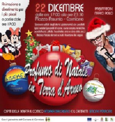 CARMIANO (LE)  –  Ci sono le luci, i sapori tipici, l’animazione ed i giochi per i più piccoli. Ed è subito festa. In piazza Assunta, a Carmiano, si respira ‘Profumo di Natale in Terra d’Arneo’. È la manifestazione organizzata dall’Associazione ‘Insieme per crescere’, in collaborazione con il GAL Terra d’Arneo e con il patrocinio del Comune di Carmiano.