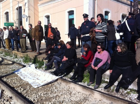 Lungo i binari, sotto l’occhio vigile di Polizia e Carabinieri la protesta animata ma pacifica, dei lavoratori.
