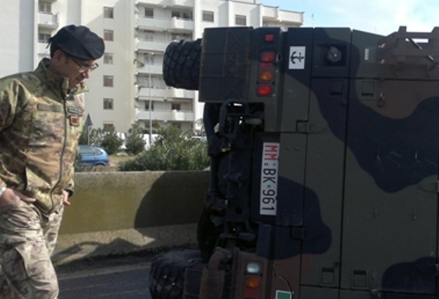 BRINDISI  –  Si ribalta per strada un mezzo della Marina Militare. Uno dei Lince in dotazione al Battaglione San Marco, per evitare una collisione con un’automobile che lo precedeva e che ha improvvisamente cambiato direzione di marcia, ha sbandato e si è adagiato su una fiancata.