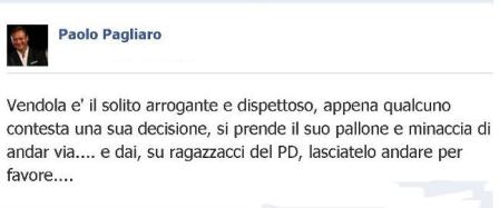 LECCE  –   Sulla bagarre fra Vendola e il PD, interviene il  Coordinatore regionale del MIR. Paolo Pagliaro posta il suo commento su Facebook: “Vendola è il solito arrogante e dispettoso, appena qualcuno contesta una sua decisione, si prende il suo pallone e minaccia di andar via.