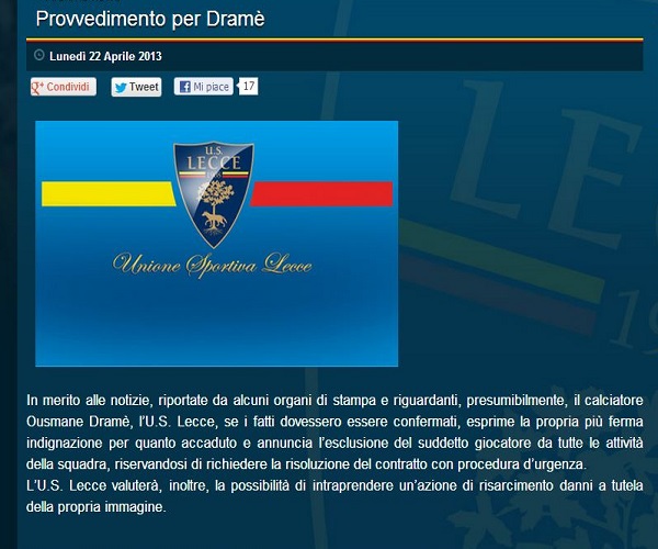 Caso Dramè, U.S.Lecce annuncia provvedimenti drastici