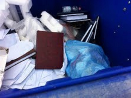 Nell’immagine, come si vede, diverse tesi di laurea accatastate nel cassonetto dei rifiuti, collocato davanti alla Facoltà, nella sede universitaria dell’Ecotekne.