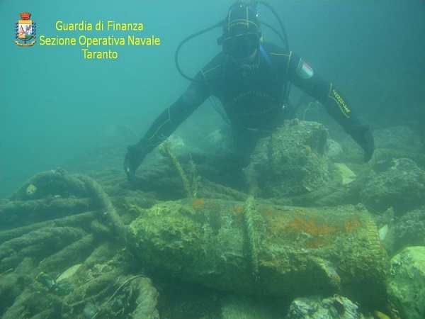 TARANTO – Un ordigno bellico di circa 90 centimetri di lunghezza, 40 di diametro, contenente probabilmente circa 80 chilogrammi di tritolo, risalente alla II Guerra Mondiale. È il ritrovamento avvenuto ieri pomeriggio, durante un’operazione di pulizia, dai sommozzatori della Guardia di Finanza di Taranto in località ‘Scesa Vasto’, nelle vicinanze del Ponte Girevole, ad una profondità di circa 2,5 metri.