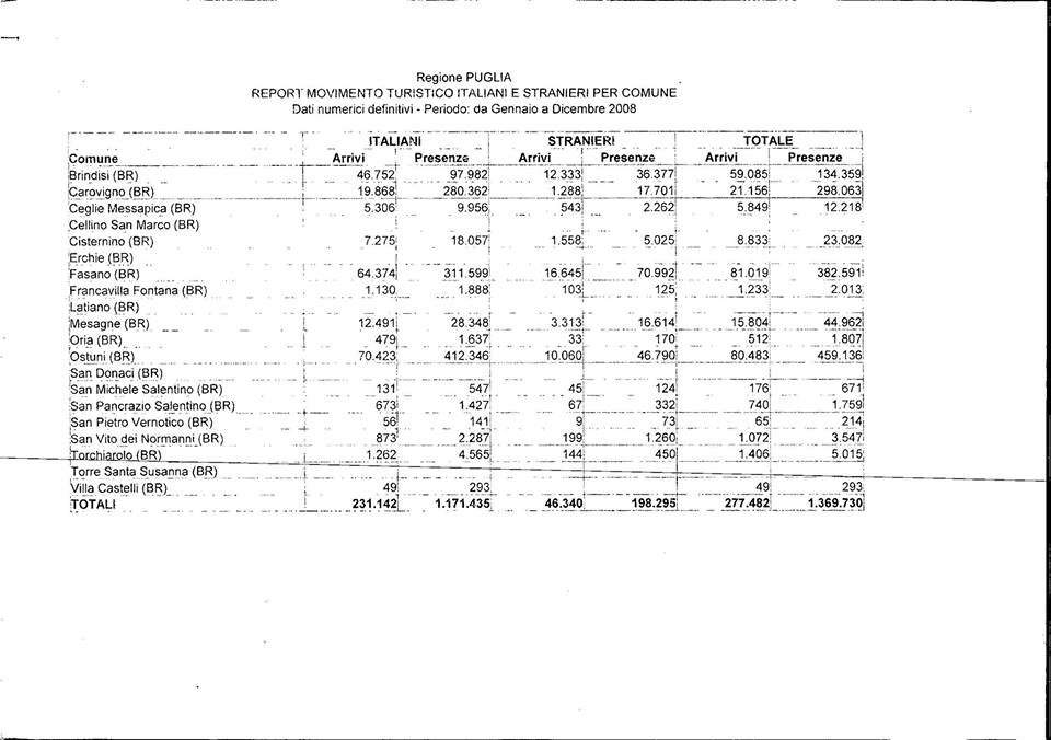 Sorprendentemente, secondo il report, ad aver goduto del maggior incremento medio è San Vito dei normanni che, dalle 3547 presenze del 2008 è passata, mirabile dictu, alle 26165 del 2012. Bene anche Cisternino (+ 15mila) e Ceglie Messapica (+9mila).