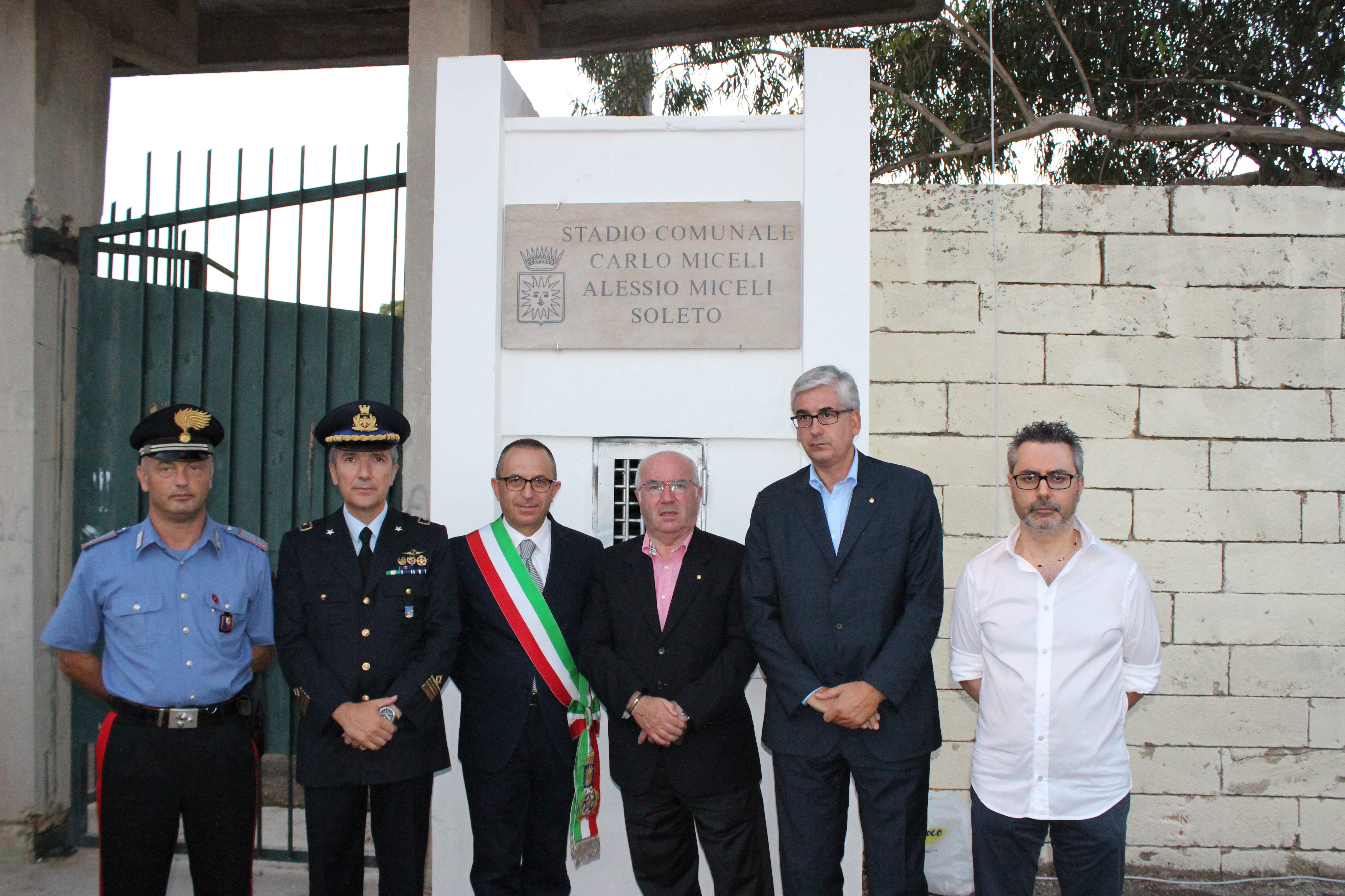 SOLETO- Toccante cerimonia, ieri a Soleto, per l’intitolazione dello stadio comunale ad Alessio Miceli, lo sfortunato calciatore morto in campo, il 27 gennaio scorso, durante una partita, a soli 34 anni.Ieri in tanti hanno partecipato alla cerimonia che si è tenuta davanti all’ingresso dell’impianto sportivo. La commozione era tangibile. C’erano amici, parenti, compagni di squadra e colleghi di lavoro. Oltre ad essere un eccellente attaccante, Alessio era anche maresciallo nell’Aeronautica Militare ed era di stanza a Galatina.