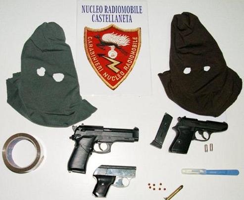 A bordo c’erano T.V., 58enne di Massafra e D.A., 42enne di Palagiano, entrambi già noti alle FF.OO. Inoltre sono state rinvenute tre pistole semiautomatiche del tipo scacciacani, modificate, prive di tappo rosso e perfettamente funzionanti nonché due passamontagna e guanti in lattice.