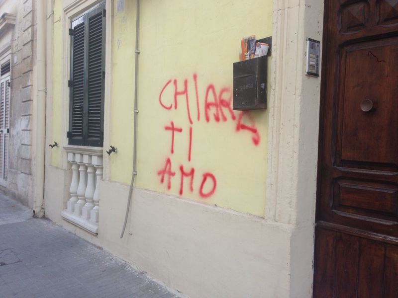 Vernice rossa, come la passione, le scritte campeggiano nel Rione di San Pio, fra Via Reale e Via di Vereto. Un gesto dettato evidentemente da un sentimento incontenibile, che l’autore ha voluto condividere non solo con l’amata Chiara, ma con tutti i residenti.