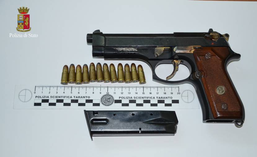 Intorno alle ore 17.00 i poliziotti, nel corso di una perquisizione in casa del RESTA, al quartiere Tamburi, hanno recuperato in un mobile del soggiorno, una pistola marca BERETTA, cal.7,65 parabellum con matricola abrasa completa di caricatore con 12 cartucce dello stesso calibro marca GFL.
