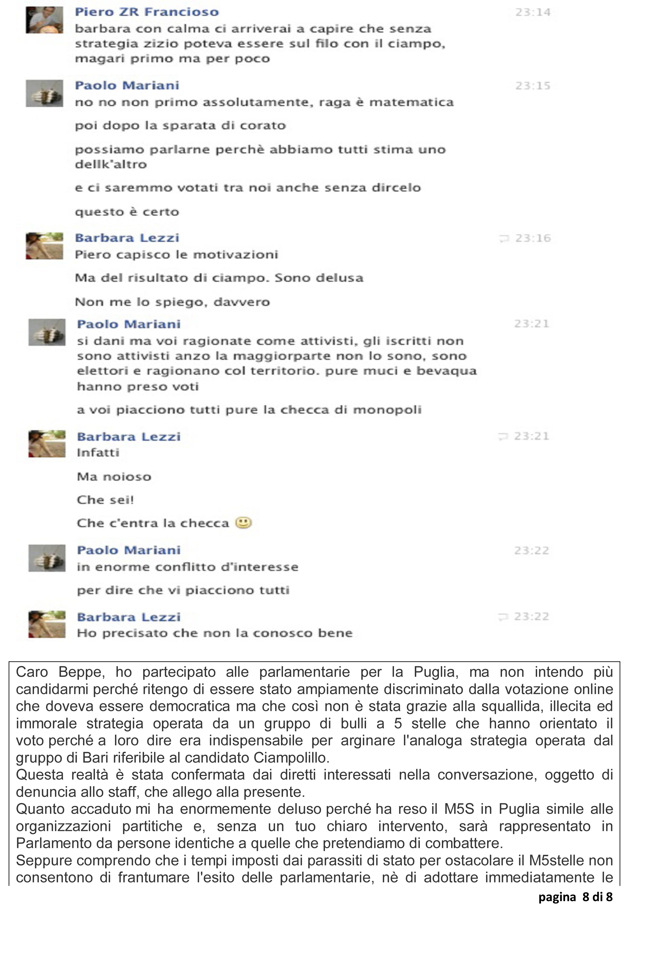 Già all’indomani del voto virtuale, Sonia Rizzello, Tonio Papa e Salvatore Pellegrino, avevano scritto al leader del Movimento per segnalare l’anomalia. “Una votazione che doveva essere democratica, si legge, ma che così non è stata grazie ad una squallida, illecita e immorale strategia operata da un gruppo di bulli a 5 stelle che hanno orientato il voto perchè a loro dire era necessario arginare l’analoga strategia operata dal gruppo di Bari riferibile al candidato Ciampolillo”.