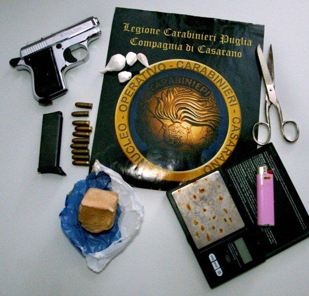I carabinieri di Casarano hanno perquisito la sua abitazione trovando armi e droga nascoste tra la camera da letto e la cantina: una pistola cal.8 di marca russa “non catalogata”  illegalmente detenuta, completa di caricatore e  10 proiettili cal.6.35 di cui uno inserito in canna, diversi grammi di cocaina , eroina e un bilancino di precisione.