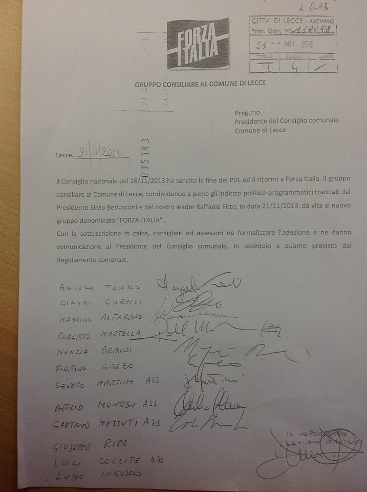 LECCE- Tre su dodici componenti del gruppo consiliare del Pdl al Comune di Lecce non firmano il passaggio a Forza Italia. Lucio Inguscio, Giuseppe Ripa e Gigi Coclite. Se il destino dell’ex assessore alla casa appare chiaro: era presente alla conferenza stampa della presentazione del Nuovo Centrodestra di Alfano insieme al collega di banco Paride Mazzotta.