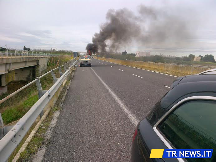 Jeep a fuoco sulla superstrada, fiamme spente dal camionista