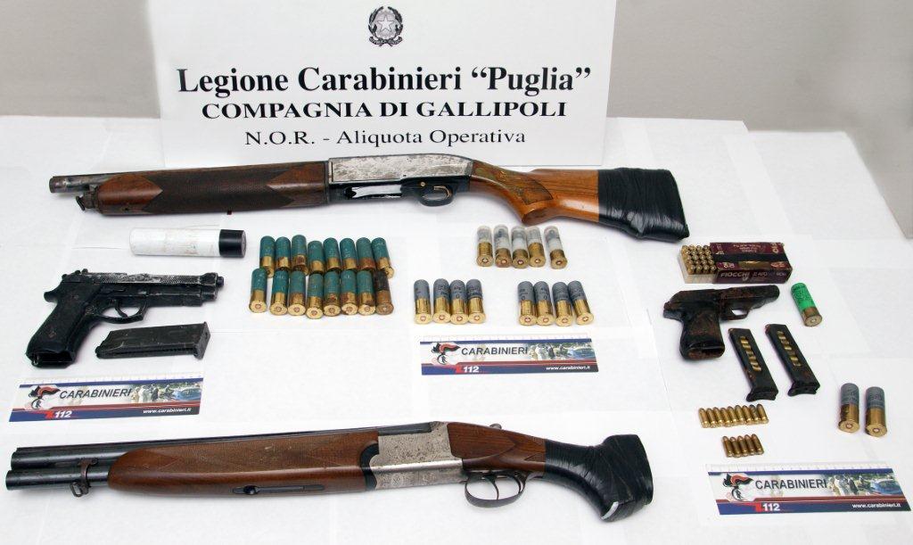 E infatti ci avevano visto giusto. Proprio lì sotto hanno rinvenuto una nicchia ricoperta di legno con all’interno un vero e proprio arsenale. Sono stati rinvenuti due fucili a canne e calcio mozzato chiusi dentro buste di cellophane e un borsello con due pistole. Uno dei fucili ed una delle pistole sono risultate essere con matricola abrasa, mentre l’altra pistola è risultata essere tipo “soft air” e quindi di libera vendita, seppur privata del necessario tappo rosso. Assieme alle armi numerose munizioni sia per la pistola (70 munizioni cal. 7,65) che per i due fucili (N. 40 cartucce cal. 12 di varie tipologie).