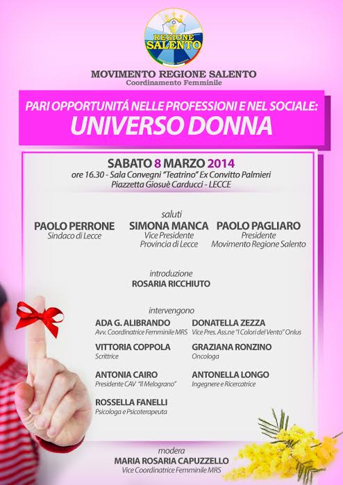 LECCE- Nella giornata internazionale dedicata alla donna, volta a ricordare le conquiste sociali, politiche ed economiche dell’universo femminile e, nondimeno, le discriminazioni e le violenze di cui le donne, purtroppo ancora oggi, sono fatte oggetto in molte parti del mondo, il COORDINAMENTO FEMMINILE del MOVIMENTO REGIONE SALENTO ha voluto rendere omaggio alla donna con un incontro dibattito sul tema “PARI OPPORTUNITA’ NELLE PROFESSIONI E NEL SOCIALE: UNIVERSO DONNA”.