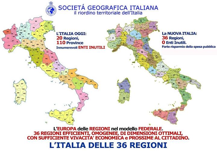 “La proposta del MIR, condivisa dalla Societa’ Geografica Italiana, ha il merito di riconoscere il primato delle identita’ territoriali senza fare un passo indietro rispetto al 1861. L’abolizione delle attuali regioni e province e un riordino territoriale con 36 nuove regioni virtuose , omogenee e identitarie. L’ipotesi delle 36 Regioni tutte a Statuto speciale e’ in grado di ridare slancio all’attivita’ amministrativa, snellendo un sistema che non riesce, ingessato, a produrre le risposte attese dai cittadini. La proposta delirante di Grillo, invece, riprende la logica dello statalismo che pensavamo fosse stato superato dopo il suo conclamato fallimento.