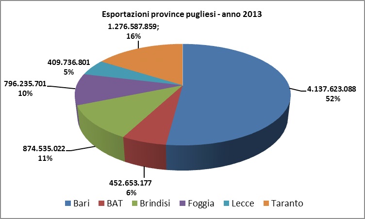 Nell’ambito della regione Puglia si riconferma Bari la provincia che traina l’export rappresentando il 52% sull’export regionale, seguita da Taranto che copre il 16% delle vendite all’estero, il cui contributo però si è quasi dimezzato nell’arco di un anno (nel 2012 l’export tarantino rappresentava il 28% di quello pugliese). Brindisi e Foggia contribuiscono rispettivamente per l’11 e il 10%, mentre fanalino di coda è la provincia di Lecce con il 5,2%, preceduta dalla Bat con il 5,7%.
