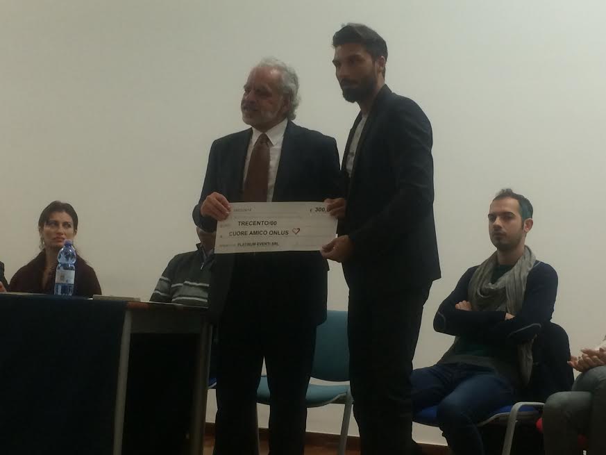Nel corso della serata è stato consegnato un assegno all’Associazione CuoreAmico Onlus, nella persona del dr. Giuseppe Peluso, responsabile del Comitato Scientifico di Cuore Amico, un assegno, offerto dal contributo di allievi e docenti  del team di “Professione Modella”.