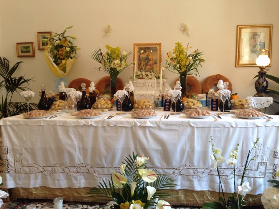 Tante bontà e prelibatezze che vengono consumate a mezzogiorno del 19 marzo dai cosiddetti “Santi” impersonati da amici o parenti delle famiglie. Quando una famiglia devota decide di “fare la tavola” invita infatti i “Santi”, da un minimo di tre (San Giuseppe, Gesù Bambino, e la Madonna, che deve essere una ragazza nubile) a un massimo di tredici ed in ogni caso sempre in numero dispari: San Giuseppe, a capo tavola, darà inizio al pranzo battendo un colpo di bastone sul pavimento; quindi con tutti gli altri assaggerà ciascuna pietanza, segnandone la fine con dei colpettini di forchetta sul piatto, per recitare una preghiera. Alla fine, la famiglia consegnerà i grossi pani ai rispettivi Santi, i quali risponderanno con un ringraziamento.