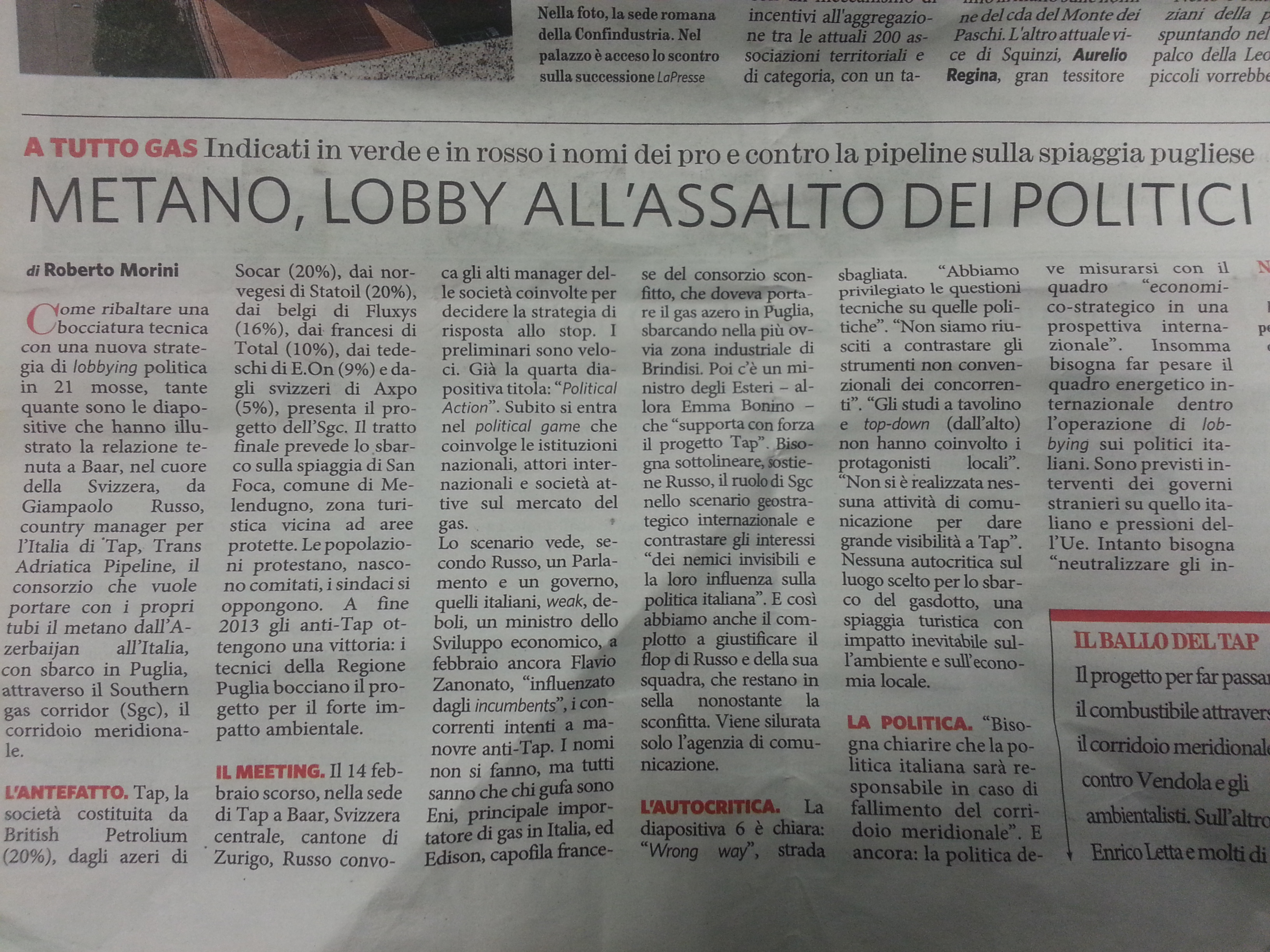 “Verde”, vale a dire favorevole a Tap, l’ex ministro degli Esteri Emma Bonino e l’ex premier Enrico Letta, “che – secondo il quotidiano diretto da Antonio Padellaro – avrebbe dovuto intervenire da una parte su Eni ed Edison e dall’altra su Claudio De Vincenti, dalemiano, sottosegretario allo Sviluppo Economico, e Gilberto Dialuce, responsabile infrastrutture energetiche allo stesso Mise, rigorosamente colorati in rosso”, insieme ai No Tap, al Comune di Melendugno, Provincia di Lecce e il governatore di Puglia Nichi Vendola. In verde, ancora, Raffaele Fitto, Forza Italia, l’ex viceministro degli esteri Marta Dassù. Diapositiva ultima, infine, quella su Massimo D’Alema e i suoi uomini, che “come con Letta, dovranno fare qualche operazione di aggiornamento”.