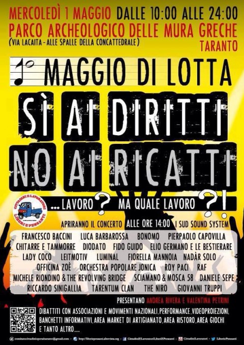 TARANTO- Il giorno tanto atteso è arrivato: a Taranto c’è il Controconcertone . E’ la seconda edizione della kermesse nella città dei 2 MARI, la seconda voluta intensamente dal Comitato Cittadini e Lavoratori Liberi e Pensanti di Taranto, il gruppo di operai e cittadini che si è formato a seguito del sequestro degli impianti inquinanti dell’Ilva nel 2012.“Per il sistema industriale italiano c’è anche un cambio culturale da fare. Per tanti anni non ci si è posti il problema della qualità di quello che si produceva e degli effetti che poteva avere”. Lo ha detto il segretario nazionale della Fiom Cgil, Maurizio Landini, intervenendo a Taranto a un dibattito in occasione del primo maggio, e auspicando che si sia “in grado di coniugare il diritto al lavoro con il diritto alla salute”.