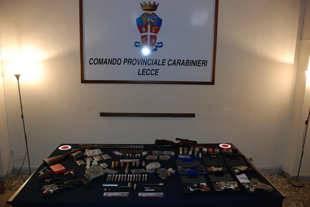 MERINE- Armi pericolosissime, pronte a sparare . I carabinieri le hanno trovate nascoste in un’abitazione di Merine. Solo messe una accanto all’altra dopo il sequestro, esposte sul tavolo nella sala del Comando Provinciale di Lecce,danno l’idea della portata dell’arsenale che Mauro Bascià, 45enne , custodiva nella sua villetta in via Lizzanello a Merine, dove abitava insieme agli anziani e ignari genitori.