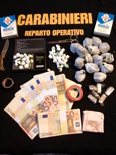 Durante la perquisizione all’interno del suo appartamento, i militari hanno rinvenuto  in un tubo per palline da tennis una 30ina di grammi di marijuana.  A casa della madre,invece,   in una cassetta nascosta in una bacheca di trofei sportivi, sono stati trovati e sequestrati: 45 dosi di cocaina;30 gr. di hashish;80 gr. di marijuana, materiale vario per il confezionamento delle dosi e 7mila euro in contanti.