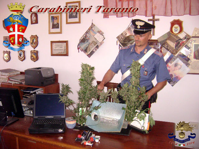 I Carabinieri dopo averlo rintracciato hanno proceduto con la perquisizione domiciliare durante la quale hanno ritrovato la refurtiva e quattro piantine di marijuana con annesso impianto di riscaldamento.