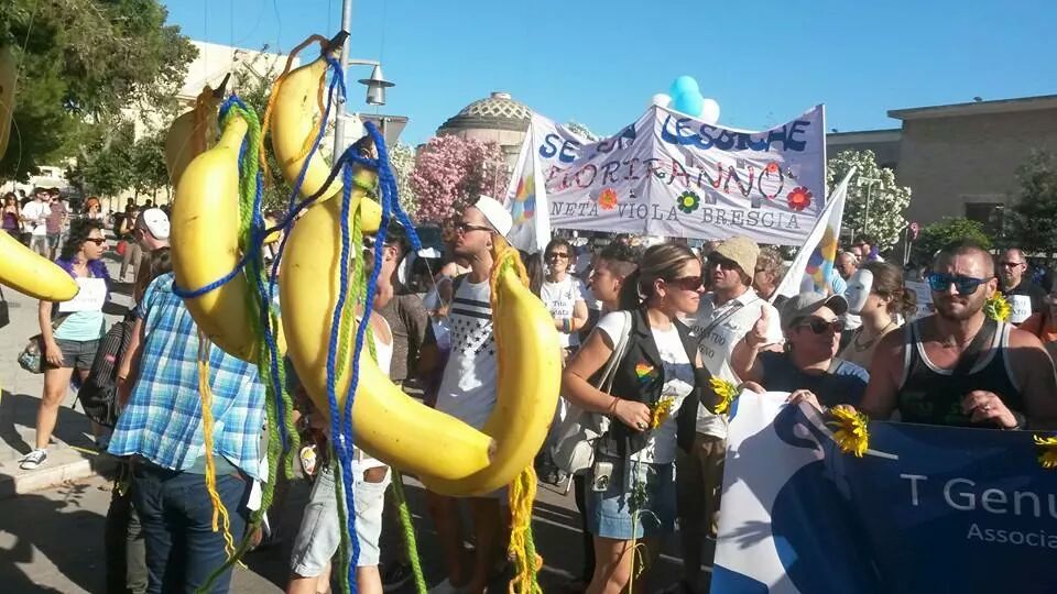 C’era anche tanto folklore e ironia nei carri pieni di caschi di banane. C’era il mondo trans leccese con abiti da show notturno, ma anche tante associazioni che gridavano i loro slogan contro l’omofobia, per chiedere pari diritti e rispetto. Strade chiuse sotto un sole cocente per una manifestazione inserita nella lunga onda nazionale e in una serie di eventi che si sono tenuti in Puglia. Nelle stesse ore, insieme a Lecce, è sceso in piazza il mondo omosessuale di Alghero, Bologna, Catania, Milano, Napoli, Palermo, Perugia, Torino, Venezia.
