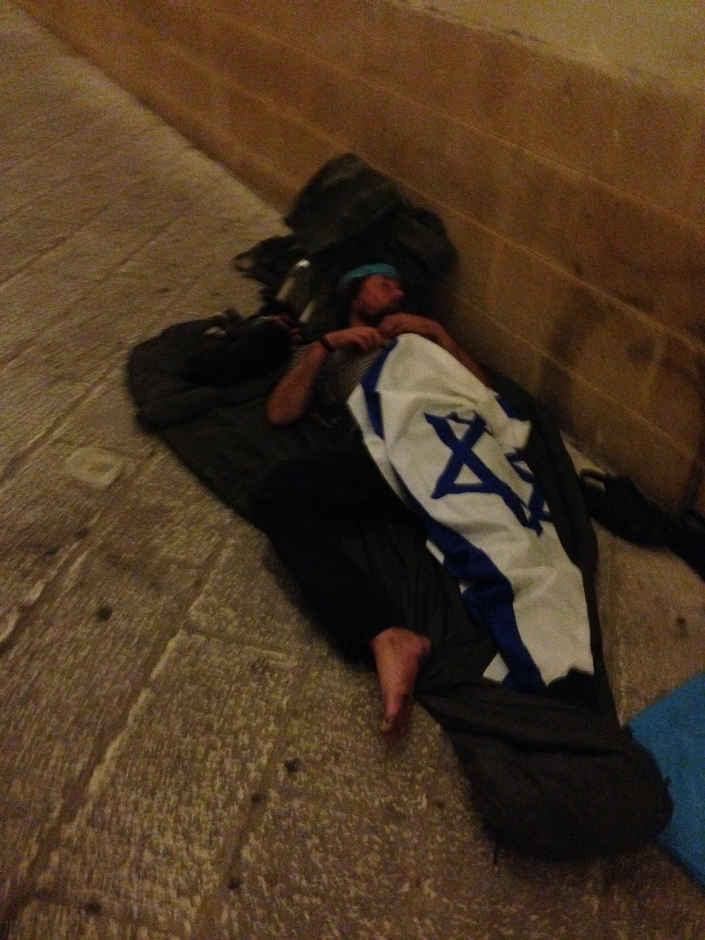 Coperto dalla bandiera israeliana, barbone dorme sotto Palazzo Carafa