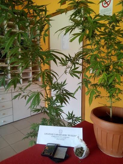 Durante la perquisizione domiciliare , i carabinieri hanno rinvenuto  due piante di marijuana, una di circa due metri e venti occultata nel Box doccia del terrazzo e un’altra adiacente di circa un metro e mezzo; 12 grammi sempre di marijuana ed un bilancino elettronico di precisione perfettamente funzionante.