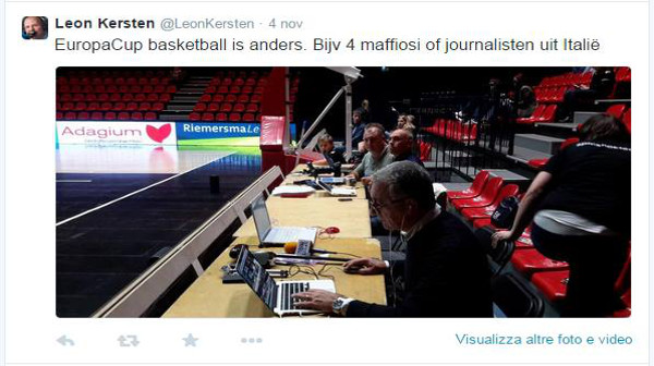 BRINDISI- Frasi offensive su Twitter dopo la sconfitta dell’Enel Basket Brindisi alla prima europea in Eurochallenge. Leon Kersten, giornalista olandese che segue le vicende dell’Spm Shoeters, la squadra avversaria dei brindisini,  in un Twitt ha usato una serie di offese nei confronti sia della squadra salentina e di Bucchi , definendolo “Schettino”, sia dei reporter al seguito dell’Enel Basket, definiti “mafiosi”.