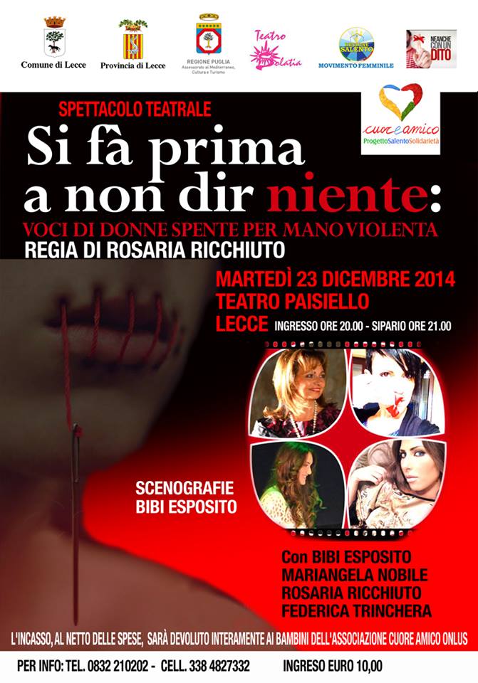 LECCE- Al Teatro Paisiello in scena la Compagnia del Teatro Solatia con “Si fa prima a non dir niente: voci di donne spente per mano violenta”. Lo spettacolo teatrale, della regista e attrice Rosaria Ricchiuto, tratta il tema del femminicidio e porta sotto i riflettori cinque Donne, cinque Personaggi molto diversi ma che hanno in comune una drammatica storia di violenza subita da raccontare.