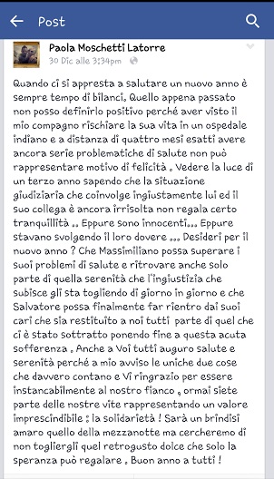 “Eppure sono innocenti…Eppure stavano svolgendo il loro dovere“. È una delle frasi che Paola Moschetti, compagna del fuciliere Massimilino Latorre, ha scritto su Fb, in occasione degli auguri per il nuovo anno. I due militari del Battaglione S. Marco hanno sempre sostenuto di essere innocenti e di aver scambiato le vittime per pirati.