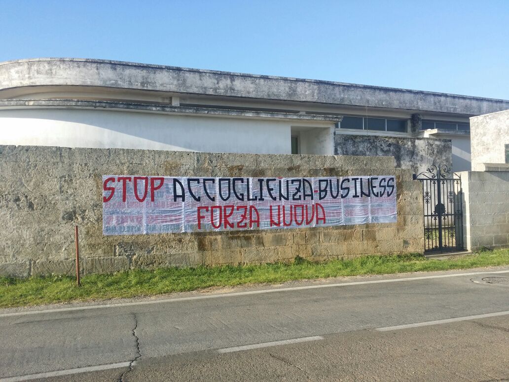 CASTIGLIONE D’OTRANTO- “Stop accoglienza business”. Porta la firma di Forza Nuova lo striscione apparso in mattinata a Castiglione d’Otranto, sul muro del cimitero, lungo una strada non scelta a caso, ma che conduce al più grande centro di prima accoglienza per migranti della provincia di Lecce.