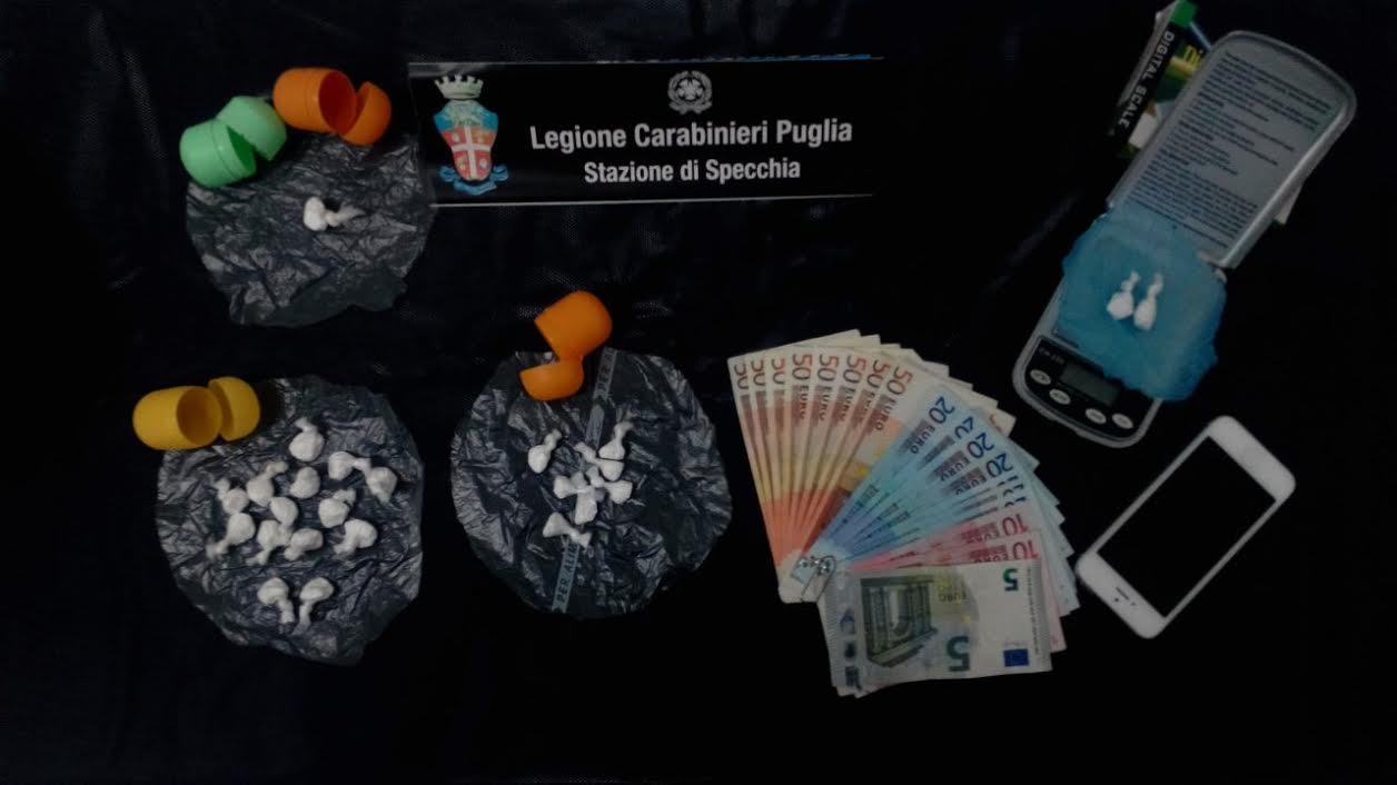 A quel punto è scattato il controllo dei carabinieri. SCHITO è stato trovato in possesso di due contenitori in plastica (tipo ovetti Kinder) uno di colore giallo e uno di colore arancione, rispettivamente contenenti 14 dosi e 7 dosi di cocaina. Successivamente è stata eseguita una perquisizione domiciliare a carico di entrambi che ha permesso di rinvenire vario materiale per il confezionamento della droga.