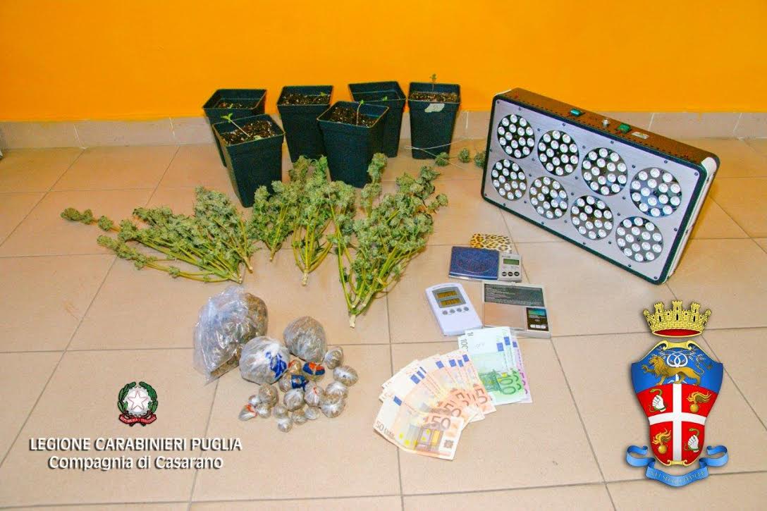 Durante una perquisizione domiciliare, i militari hanno rinvenuto in cucina: 18 involucri in cellophane trasparente di “MARJUANA” nonché un bilancino di precisione elettronico; nella camera da letto  – all’interno di un mobile porta TV – tre involucri sempre della stessa sostanza stupefacente, un altro  bilancino di precisione  ed un cofanetto con  1300 euro.