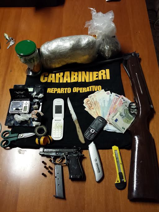 CASTRI’ DI LECCE- I militari del Nucleo Investigativo, nel corso della nottata, hanno arrestato Christian DELLA TORRE, 31enne di Castrì di Lecce. I militari da qualche giorno seguivano i movimenti del giovane, a causa di uno strano via vai di tossicodipendenti dalla sua abitazione. Ieri sera il blitz: durante la perquisizione domiciliare sono stati trovati: circa  700 gr. di marijuana suddivisa in due panetti; materiale per il confezionamento delle dosi; una pistola modificata calibro 7,65 di fabbricazione slava, completa di serbatoio e 6 cartucce; un fucile ad aria compressa; e 1790 €.