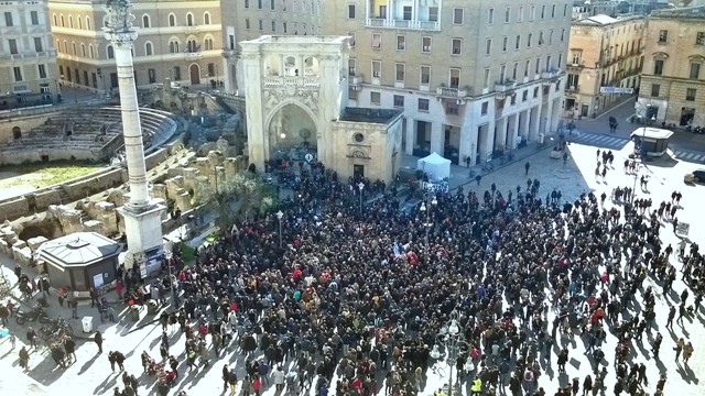 LECCE- Hanno riempito Piazza Sant’Oronzo già nel primissimo pomeriggio. Hanno portato con loro ramoscelli d’ulivo e voglia di far sapere che sono pronti a difendere gli ulivi, non solo dal disseccamento rapido, ma anche da misure obbligatorie che impongono l’eradicazione degli alberi infetti e l’utilizzo di insetticidi, “senza certezza né trasparenza”. Sono stati in migliaia i cittadini che hanno partecipato alla chiamata a raccolta organizzata, su impulso dello scrittore Pino Aprile e del cantante Nando Popu, dal Csv e dalle associazioni Spazi Popolari, Peacelink, Lilt, Forum Ambiente e salute e Casa delle Agriculture Tullia e Gino, con l’adesione di decine di altre realtà.