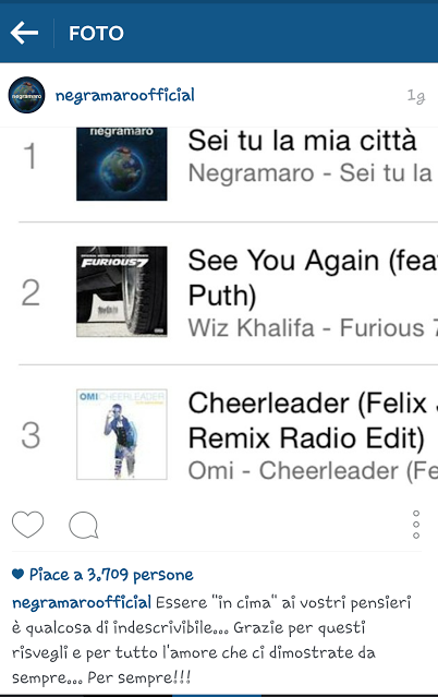 LECCE- “Essere in cima ai vostri pensieri è qualcosa di indescrivibile…grazie per questi risvegli e per tutto l’amore che ci dimostrate da sempre…per sempre”…con queste parole pubblicate sulla pagina ufficiale Instagram della band salentina i Negramaro ringraziano i fan...Il sestetto, a poche ore dall’anticipazione del nuovo singolo, regalata ai milioni di fan, sono primi nella classifica di i-Tunes.