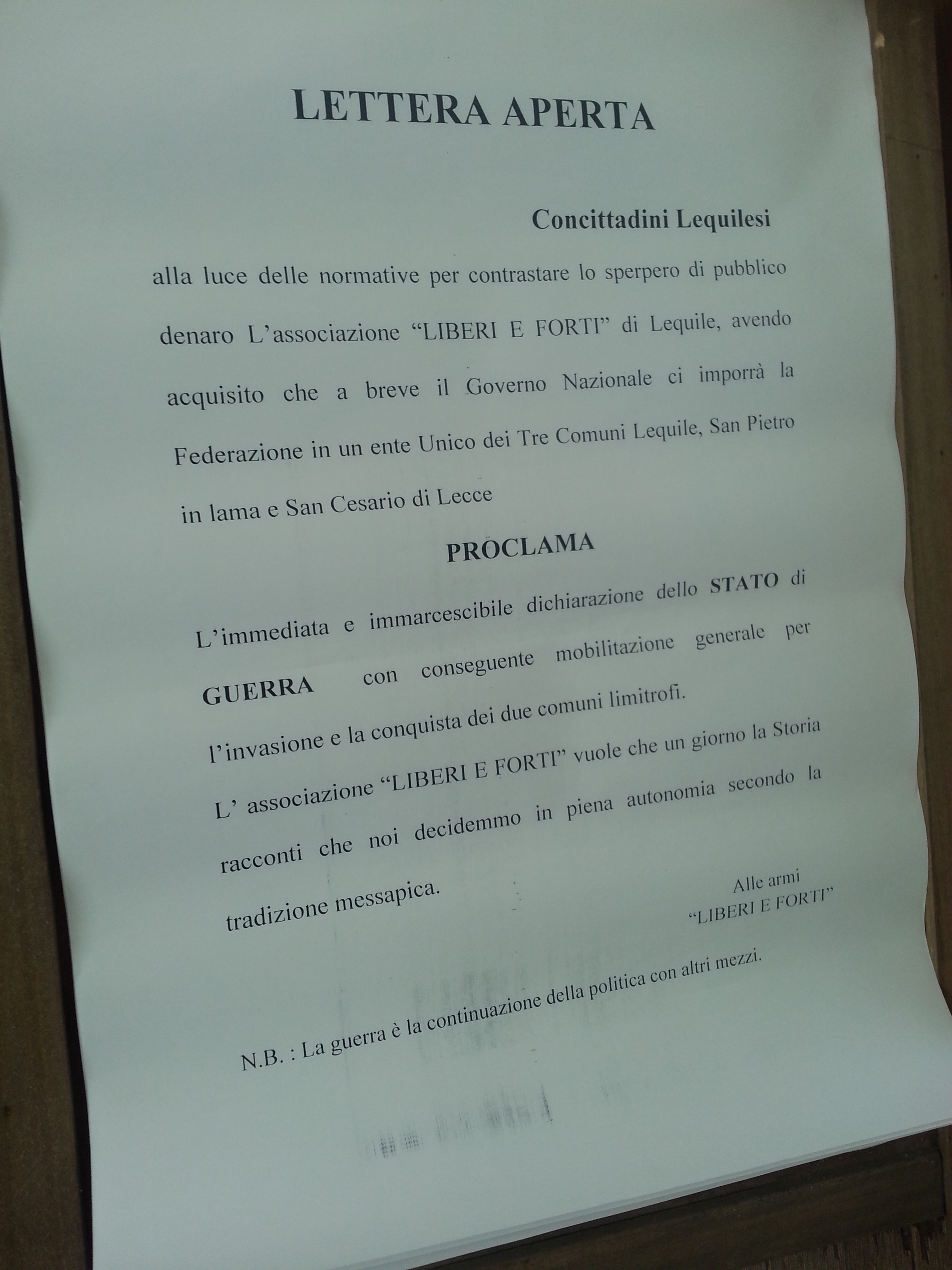 La firma è di un’associazione: “Liberi e forti”. “Alla luce delle normative per contrastare lo sperpero di pubblico denaro. L’associazione  di Lequile, avendo appreso che a breve il Governo nazionale imporrà la Federazione in un ente unico dei tre comuni di Lequile, San Pietro in Lama e San Cesario, proclama l’immediata dichiarazione dello stato di guerra con conseguente mobilitazione generale per l’invasione e la conquista dei due comuni limitrofi”.