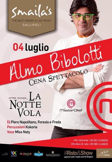 GALLIPOLI- Sapori, musica e divertimento. Questa sera allo Smaila’s di Gallipoli si terrà il cooking show di Almo Bibolotti, il cuoco barese protagonista della terza edizione di Masterchef, arrivato secondo.