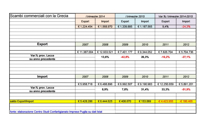 “Senza dubbio -è l’analisi di confartigianato- la più volte minacciata «Grexit» e le discussioni delle ultime settimane che hanno visto protagonista Alexis Tsipras e l’Unione Europea hanno contribuito a questa sorprendente inversione. Una situazione mai verificatasi prima, – commenta Francesco Sgherza, presidente di Confartigianato Imprese Puglia- su cui ha pesato anche l’affidabilità finanziaria del sistema produttivo ellenico, ridotta al punto da essere considerata un rischio per gli scambi. Insomma, non solo i nostri imprenditori hanno perso un mercato di riferimento ma hanno purtroppo guadagnato la concorrenza di un agguerrito competitor, perlomeno in alcuni settori produttivi, in forza della svalutazione dei beni prodotti ad Atene”. La provincia di Lecce, invece, importa meno di quanto esporti. Anche se c’è da sottolineare che le esportazioni valgono molto meno rispetto al passato.