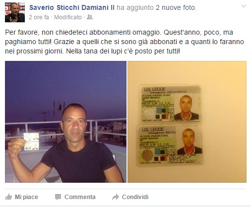 LECCE- Il presidente in pectore del Lecce Sticchi Damiani, per invitare a sottoscrivere quanti più abbonamenti possibile, posta la foto della sua tessera su Facebook e tuona contro chi va chiedendo continuamente omaggi: “Per favore non chiedeteci abbonamenti gratis – scrive Sticchi Damiani sul social network -. Quest’anno, poco, ma paghiamo tutti”. E conclude il pensiero rivolgendo un ringraziamento: “Grazie a chi si è già abbonato e a quelli che lo faranno nei prossimi giorni. Nella tana dei lupi c’è posto per tutti”, suona la carica.
