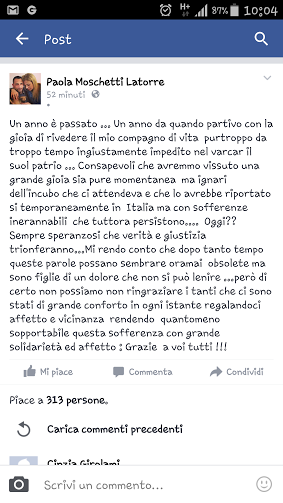 TARANTO- Un anno fa Massimiliano Latorre fu colpito da un attacco ischemico. Un malore improvviso che quella notte tra il 31 agosto e il primo settembre portò il marò a un ricovero d’urgenza nel reparto di neurologia dell’ospedale di Nuova Delhi. E oggi Paola, ringraziando chi è stato e continua ad essere a loro vicini, ricorda quel triste episodio in un post su Facebook: “Un anno è passato … Un anno da quando partivo con la gioia di rivedere il mio compagno di vita purtroppo da troppo tempo ingiustamente impedito nel varcar il suol patrio … Consapevoli che avremmo vissuto una grande gioia sia pure momentanea ma ignari dell’incubo che ci attendeva e che lo avrebbe riportato si temporaneamente in Italia ma con sofferenze inerannabili che tuttora persistono…”