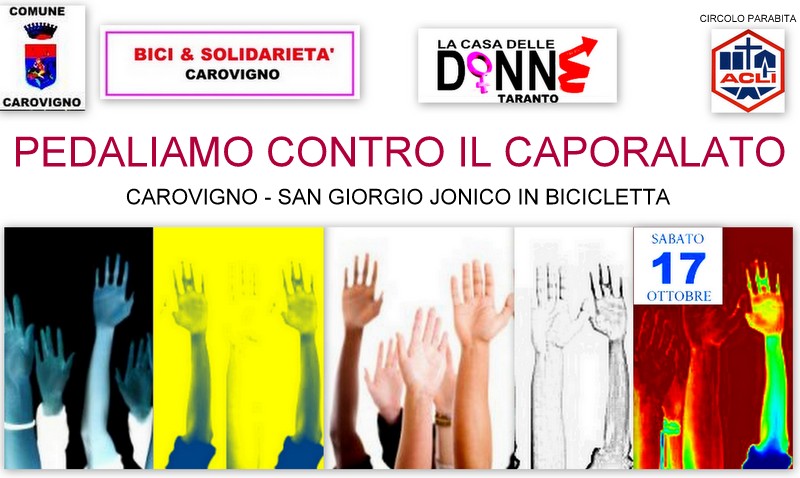 CAROVIGNO – Una pedalata tra amici contro il Caporalato è l’dea dalla quale nasce l’evento “Pedaliamo contro il Caporalato”, organizzato da “Bici e Solidarietà” di Carovigno (BR), “Casa delle Donne” di Taranto e Circolo ACLI di Parabita (LE), che si svolgerà sabato 17 ottobre 2015 e potrà contare sulla partecipazione dell’Associazione sportiva Friends’ Bike.