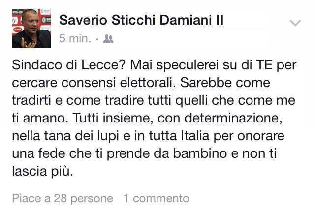 Questa mattina però ha voluto usare il profilo facebook per fare l’ennesima dichiarazione d’amore alla sua squadra del cuore, il Lecce, giurando eterno amore ad una fede che, come scrive, “ti prende da bambino e non ti lascia più”. E al cuore non si comanda… per essere felici, al cuore ci si arrende. Si avvia così a diventare a tutti gli effetti, molto probabilmente, il Presidente dell’’U.S. Lecce.