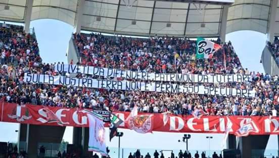 Ma non solo. Anche gli sportivi non esitano a lasciare il segno. Accade in curva, nello stadio di Bari, dove è ben visibile uno striscione. La foto è stata pubblicata su Facebook accompagnata da un post: “Noi tutti sappiamo della storica rivalità tra la tifoseria del Bari e le tifoserie salentine. Eppure la farsa xylella è riuscita a far dimenticare tutto. Ha fatto un ‘miracolo’, ormai la menzogna dell’epidemia la conoscono tutti. Non a caso -si continua a leggere- debbono usare un esercito di poliziotti, carabinieri e forestali, oltre ai professionisti della disinformazione, per applicare il piano Xylletti.ivi da difendere, patrimonio da tutelare. Sulla nostra terra non è permesso speculare”