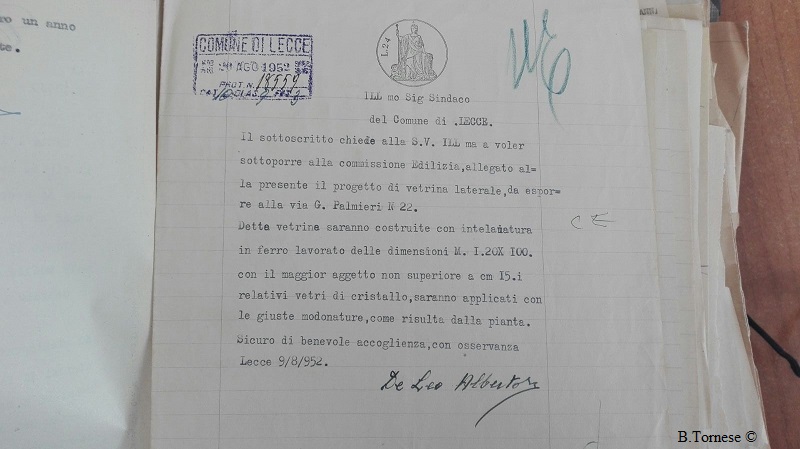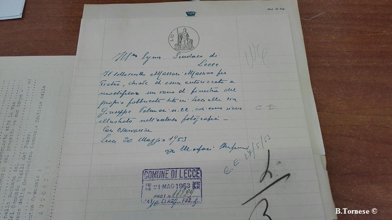 E pensare che nell’archivio storico del comune di Lecce si trova il documento risalente al 1952, in cui Massimo Massari, proprietario dell’immobile in via Palmieri numero 22 (allora civico 18°), chiedeva alla commissione edilizia dell’epoca, di realizzare il progetto di “vetrina laterale costruita con intelaiatura in ferro lavorato e relativi vetri di cristallo”.
